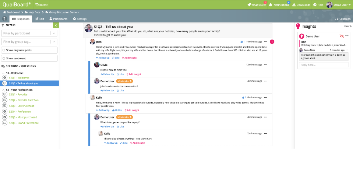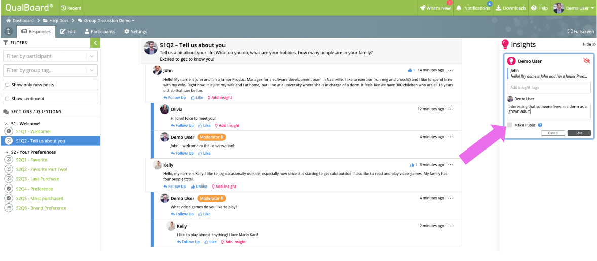 Insights allow moderators to mark responses that stand out. Examples for use include a description of why the response was meaningful, or to make a note for other moderators to see.