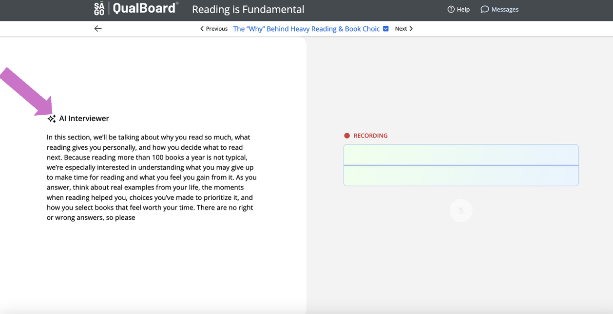 All messages from the AI Interviewer will appear on the left side of the screen. You will hear the question and will be able to read the question.